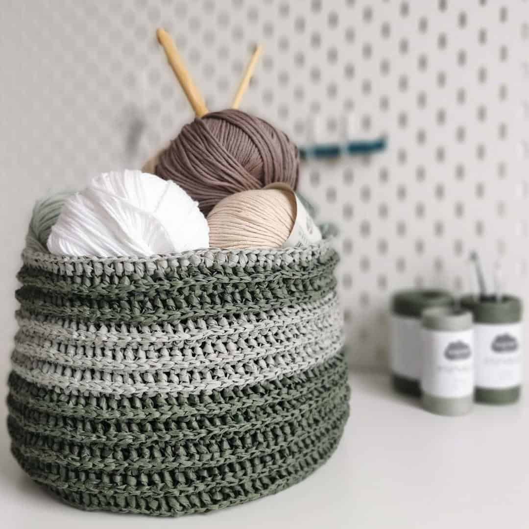 Dieses Utensilo ist nicht nur äußerst praktisch, sondern bietet dem Inhalt auch zusätzlichen Halt durch seine gehäkelte Bodenplatte aus Holz. Mit einer Höhe von 18 cm und einem Durchmesser von 25 cm für den größeren Korb, sowie 12 cm Höhe und 15 cm Durchmesser für den kleineren, ist das Utensilo vielseitig einsetzbar. Es ist ideal zum Verstauen von verschiedenen Gegenständen, sei es im Bad, auf dem Schreibtisch oder anderswo im Haus. Der Korb wird aus Kremke Soul Wool Papyrus Garn in zwei Farben gehäkelt: Khaki und Grüngrau. Eine 4,0 mm Häkelnadel wird empfohlen. Kostenfreie Anleitung und die passenden Materialien bekommst du in unserem Online-Shop auf Wollke.