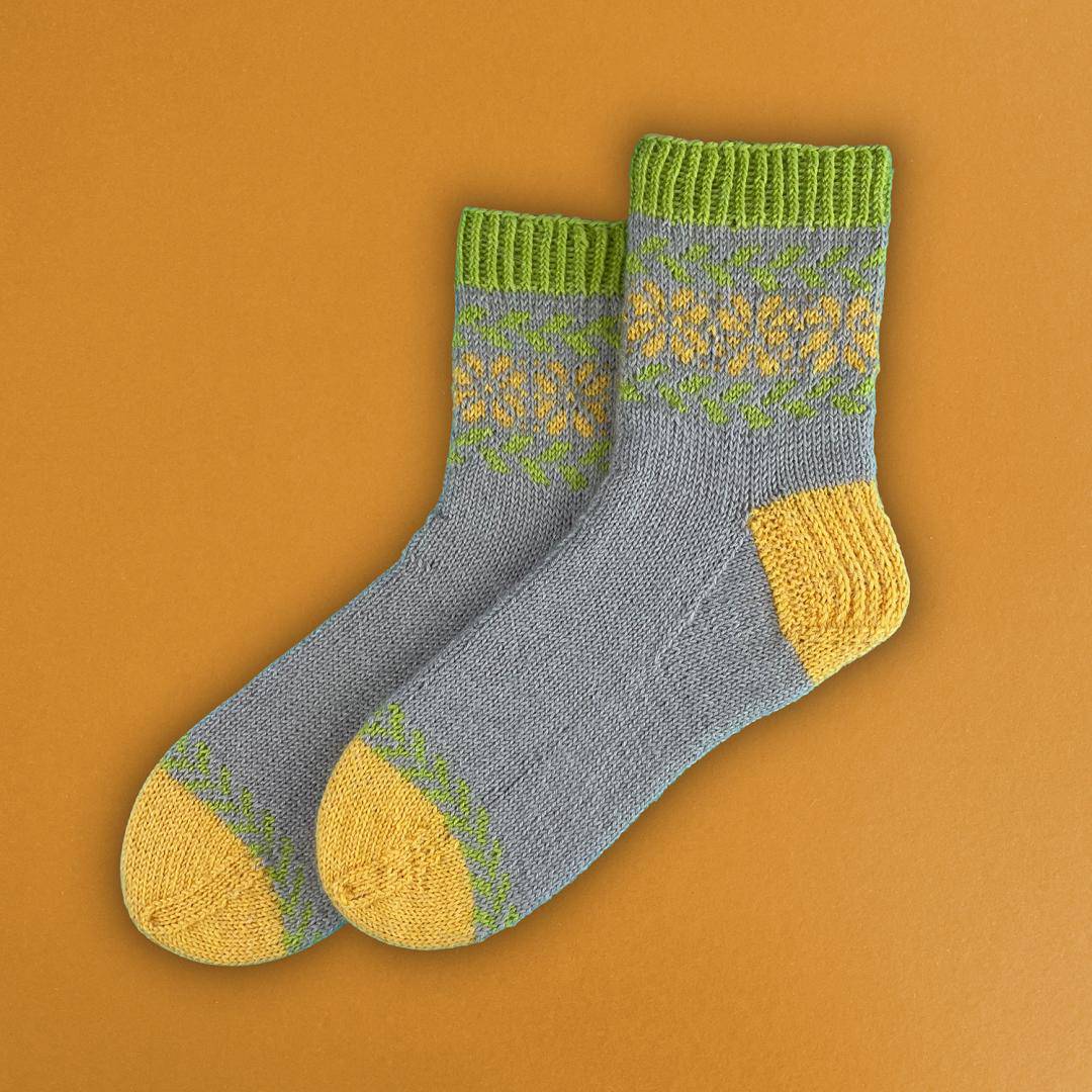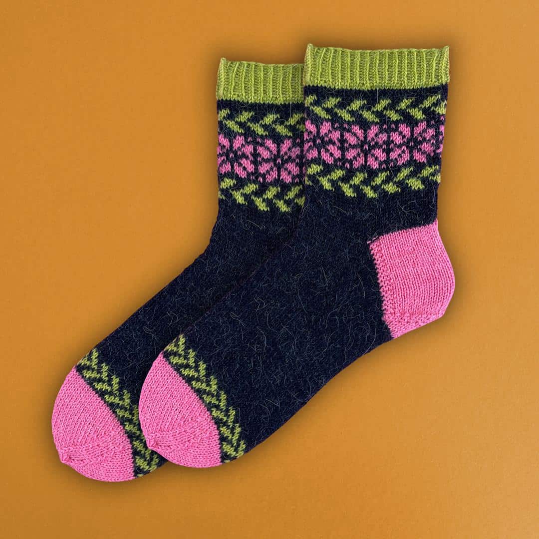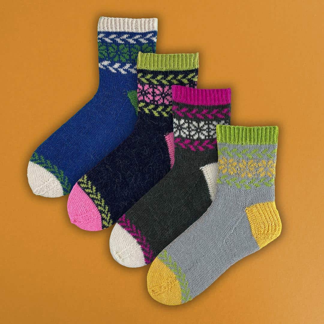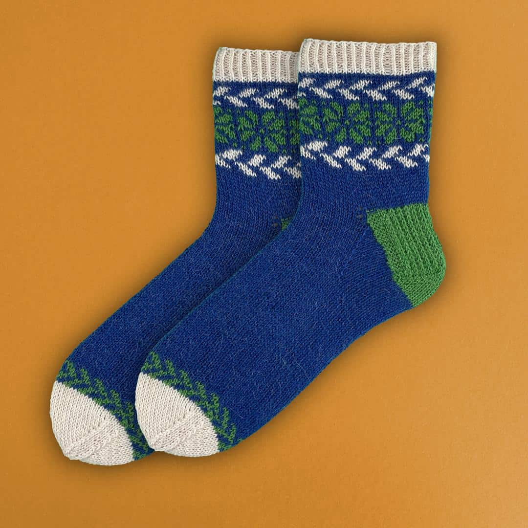 Diese Anleitung hilft dir, wunderschöne dreifarbige Socken zu stricken. Die Socken haben eine Herzchenferse und eine Bandspitze, die sie besonders bequem machen. Für Damensocken benötigst du 75g Kremke Soul Wool Edelweiss Alpaka 4-fach. Wenn du die Socken wie auf dem Bild mit wechselnden Hauptfarben stricken möchtest, benötigst du von jeder Farbe ein Knäuel. Planst du, beide Socken in den gleichen Farben zu machen, so brauchst du zwei Knäuel von der Hauptfarbe und je ein Knäuel von den Kontrastfarben. Die empfohlenen Nadeln sind ein 2,5 mm Nadelspiel. Bestellen Sie diese Anleitung und die passende Wolle bequem online auf Wollke.