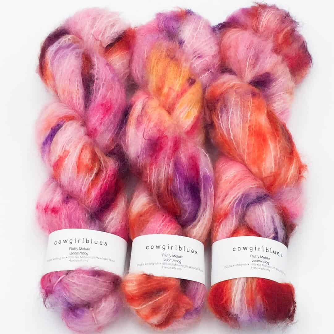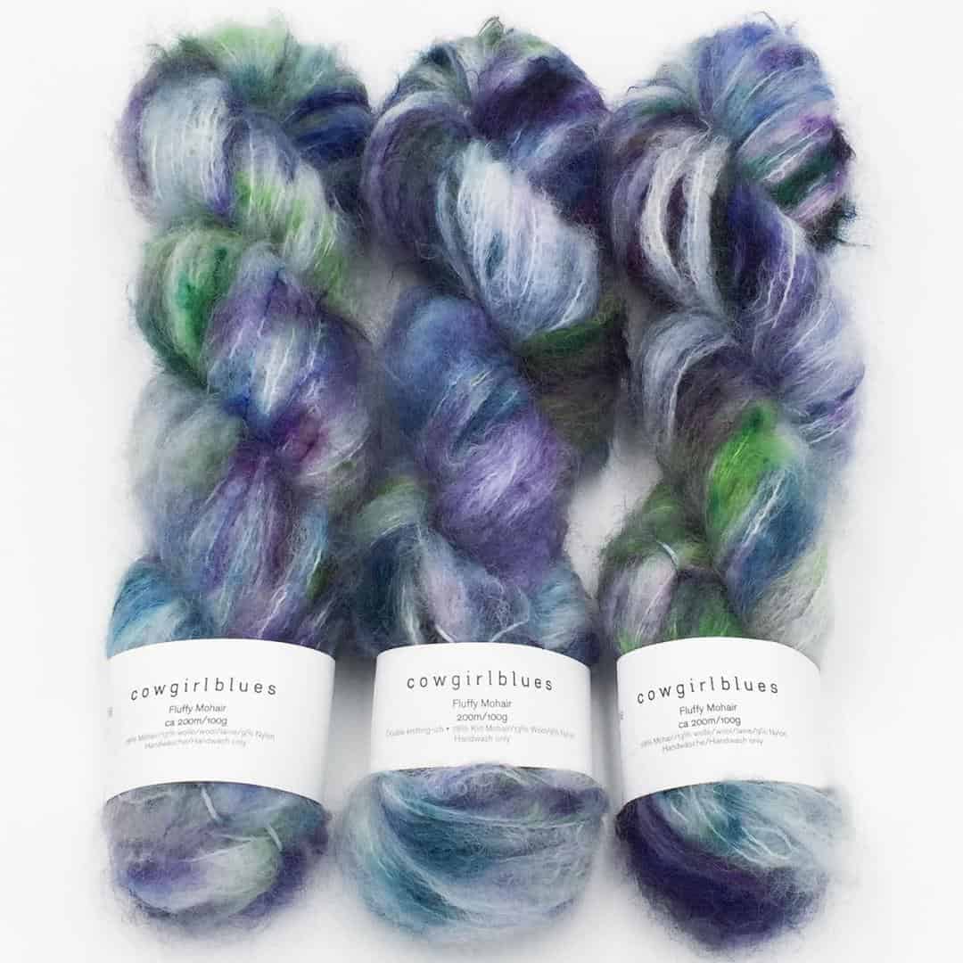 Das Fluffy Mohair Blend von Cowgirl Blues ist das ideale Garn für alle, die den flauschigen Komfort von Mohair erleben möchten, aber eine etwas dickere Variante bevorzugen. Das Garn ist äußerst ergiebig; für einen kurzärmeligen Pullover benötigt man lediglich 200g. Um die volle Weichheit des Garns zu erreichen, sollte es locker verarbeitet werden. Jede Strangfarbe kann variieren, selbst innerhalb derselben Partie. Daher empfehlen wir, beim Wechsel zu einem neuen Knäuel reihenweise oder rundenweise abwechselnd zu arbeiten, um die Farbunterschiede harmonisch zu integrieren. Das Mohair stammt aus Südafrika und wird dort mit viel Liebe handgefärbt. Die melierten Farben bestehen aus denselben Grundfarben wie die einfarbigen Varianten und bieten interessante und harmonische Färbungen. Diese lassen sich perfekt mit den einfarbigen Versionen kombinieren.
