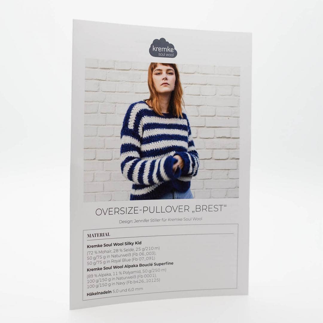 Dieser gemütliche, Oversized-Pullover mit Rundhalsausschnitt und langen Ärmeln kombiniert einen modernen Stil mit klassischem Flair. Er wurde mit viel Liebe zum Detail entworfen und ist in den Größen 36/38 und 40/42 erhältlich. Für die Herstellung des Pullovers benötigst du Kremke Soul Wool Silky Kid und Kremke Soul Wool Alpaka Bouclé Superfine in zwei verschiedenen Farben. Die abgebildete Variante besteht aus einer Kombination aus Naturweiß und Royal Blue/Navy. Bestellen Sie jetzt die Anleitung und die passende Wolle in unserem Online-Shop und häkeln Sie Ihr neues Lieblingsteil.