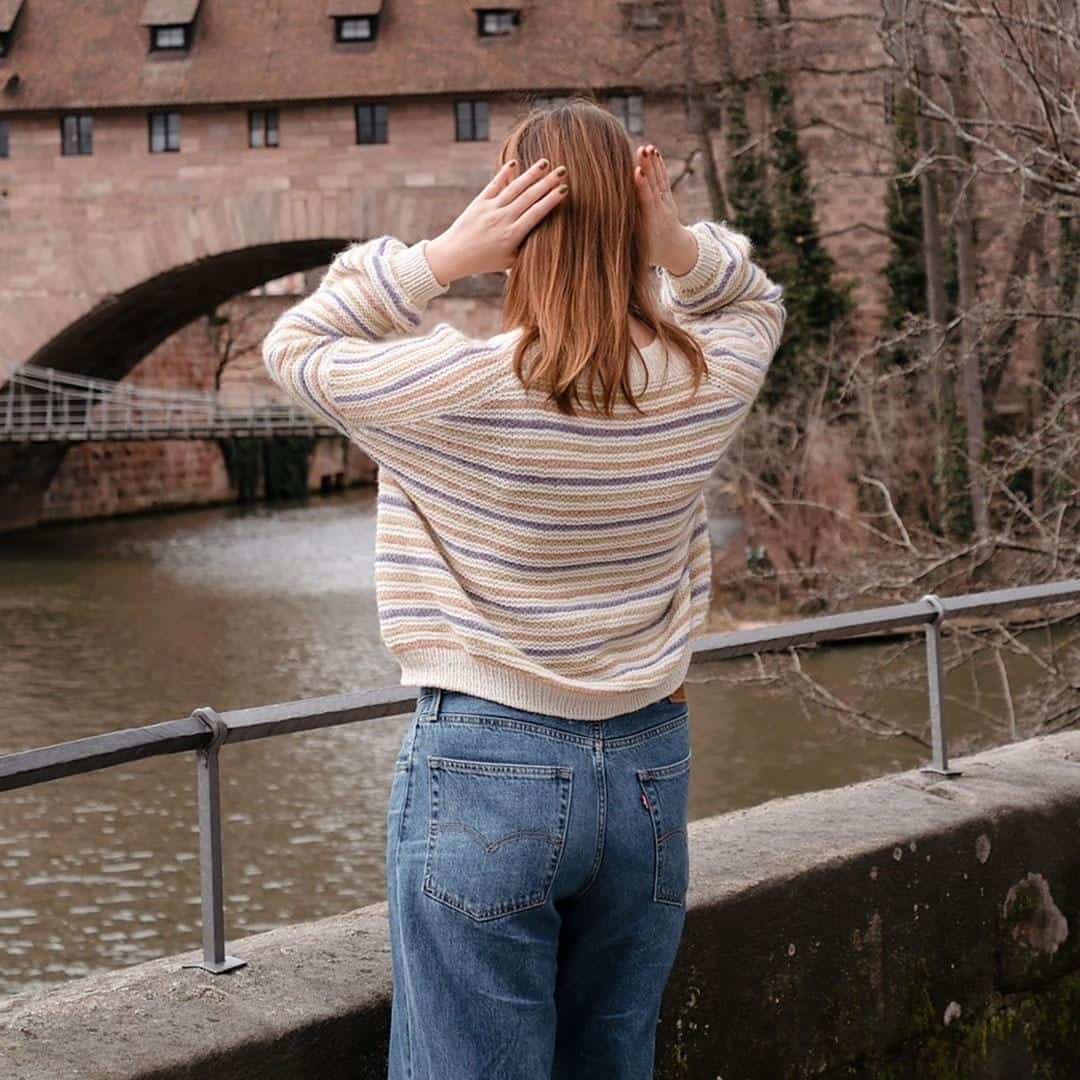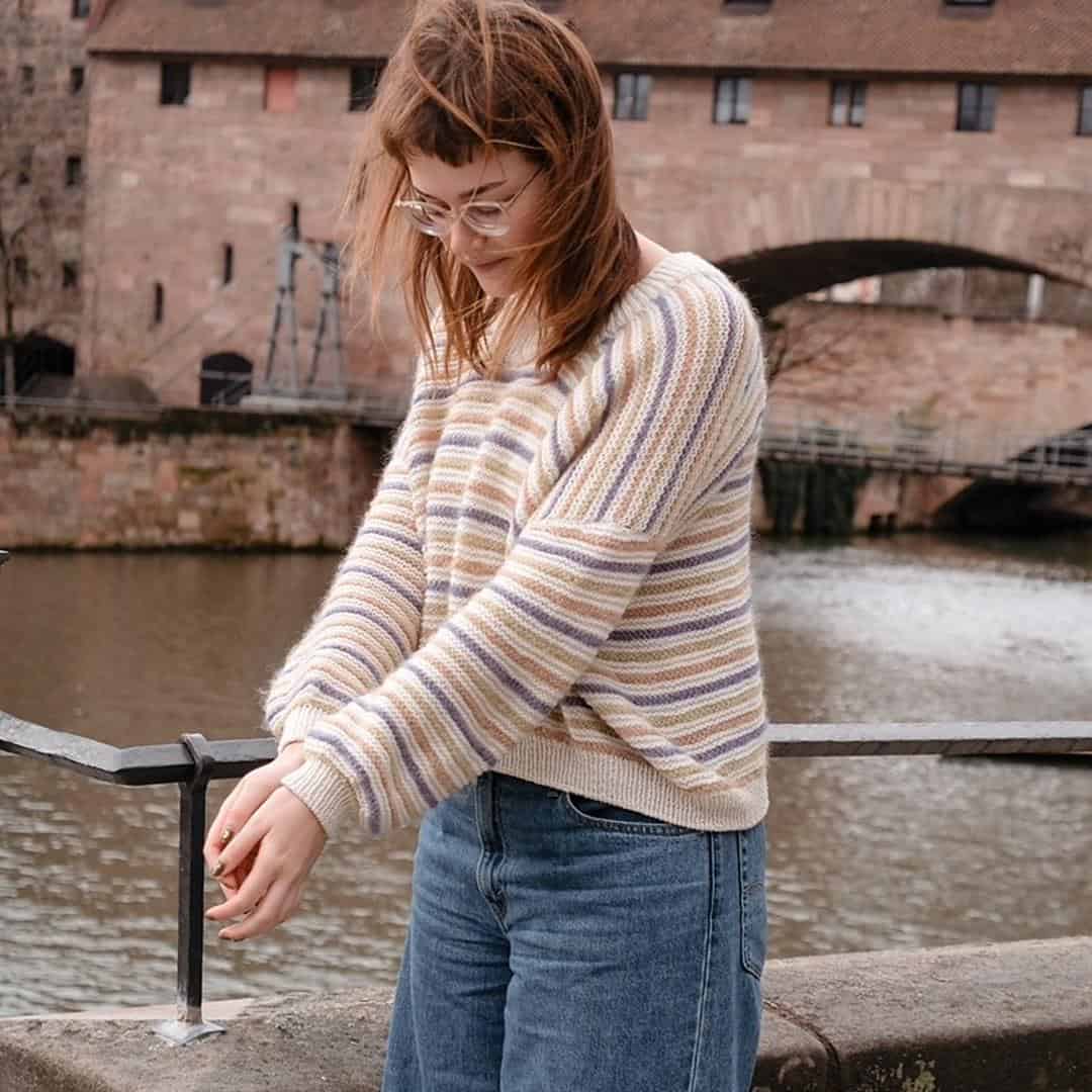 Dieser Pullover wird nahtlos von oben nach unten gestrickt. Abwechselnde Streifen entstehen durch die Kombination von Merinowolle und dreifach gehaltener Mohairwolle. Die Anleitung ist in verschiedenen Größen erhältlich: XS bis 4XL. Der Pullover hat eine positive Weite von ca. 24 – 29 cm. Empfohlene Nadeln sind Rundstricknadeln in den Größen 5,0 mm und 4,0 mm. Für das Projekt wird sowohl Merinowolle als auch Mohair-Seiden-Garn benötigt.