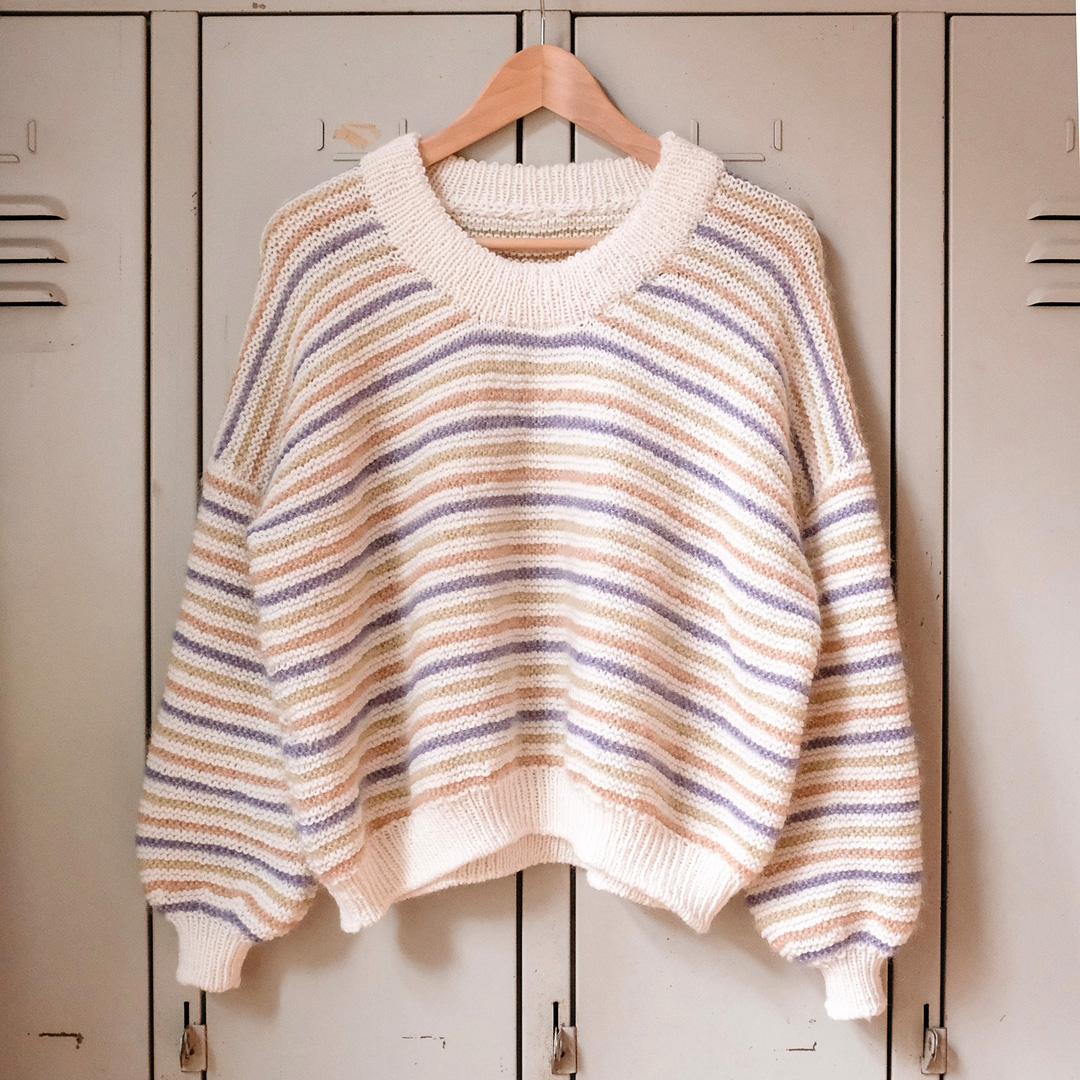 The sweater is knit in alternating stripes with Merino held single and Mohair held triple.
