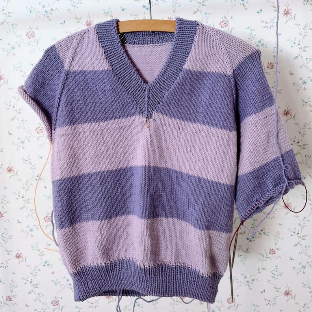 Dieser „Blouson“ ist ein vielseitiger V-Ausschnittpullover, der für jede Jahreszeit perfekt geeignet ist. Der Pullover wird glatt rechts gestrickt und die Passe wird von oben nach unten mit Raglanzunahmen gearbeitet. Nach der Passe werden Rumpf und Ärmel getrennt und separat in Runden gestrickt. Das Bündchen wird mit rechten und linken Maschen abgeschlossen.