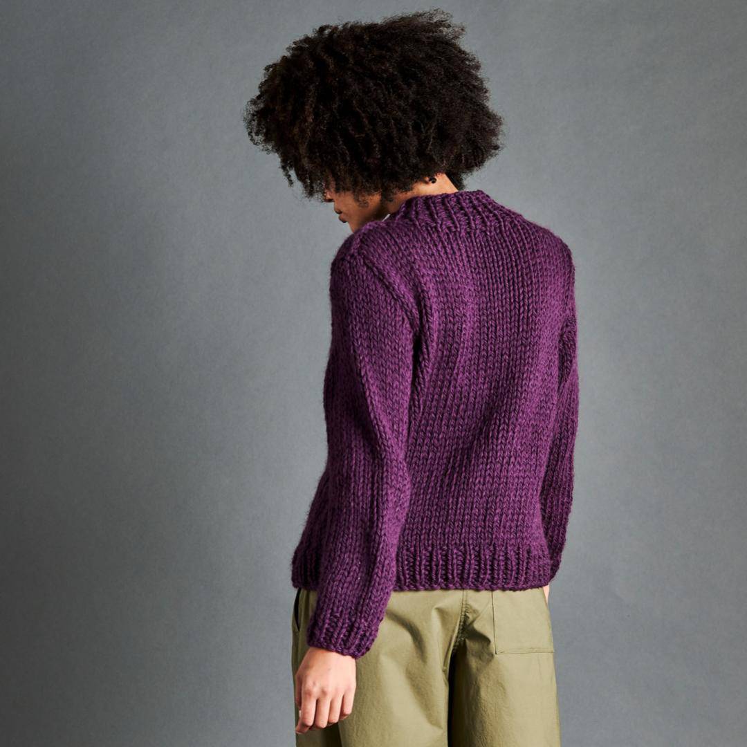 Dieser Strickpullover ist ein stilvoller und schlichter Pullover, der in glatt rechts mit Rippenbündchen und Rippenausschnitt gestrickt wird. Er ist in den Größen XS, S, M, L und XL erhältlich und bietet eine Oberweite von 86 bis 128 cm sowie eine Länge von 49 bis 57 cm. Die Ärmellänge variiert zwischen 43 und 45 cm. Für diesen Pullover wird eine Garnmenge von 500 bis 600 g Erika Knight Maxi Wool benötigt. Das Modell auf den Fotos wurde in der Farbe Mulberry (Farbcode 219) gestrickt. Empfohlene Nadelstärken sind 10 mm und 12 mm. Bestelle die Anleitung und das passende Garn einfach online bei uns und beginne noch heute mit deinem zukünftig gemütlichsten Pullover.