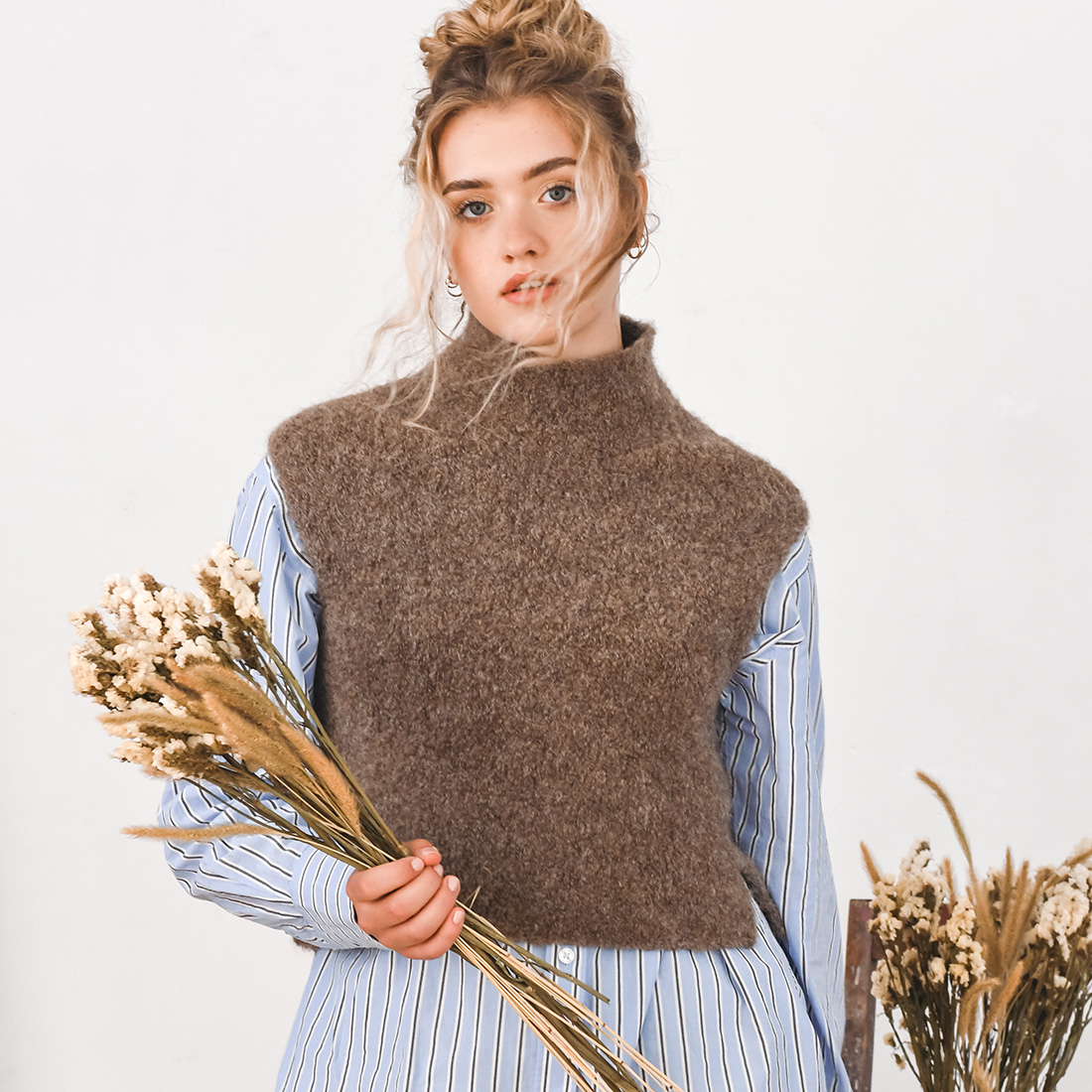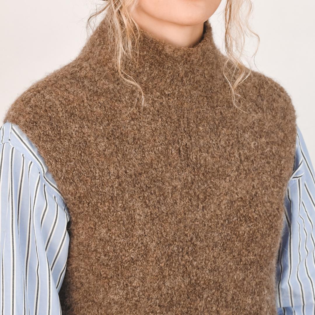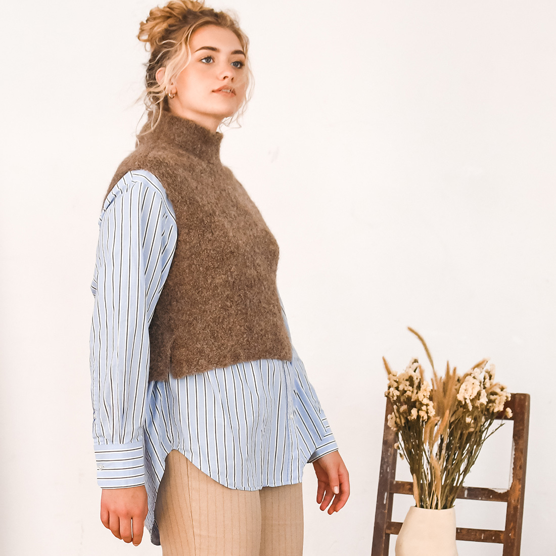 Dieser Pullunder von Luisa Holm wird nahtlos von oben nach unten gestrickt. Zuerst wird der Kragen in Runden gearbeitet, gefolgt von verkürzten Reihen und Zunahmen für die Schultern. Der Pullunder hat einen Negative Ease von 5–10 cm, was ihm eine schlanke Passform verleiht. Er ist in verschiedenen Größen erhältlich und wird aus Kremke Soul Wool Alpaca Bouclé Garn gestrickt, zweifädig verarbeitet. Die empfohlene Nadelstärke variiert zwischen 3 mm und 4 mm, je nach gewünschter Maschenprobe.