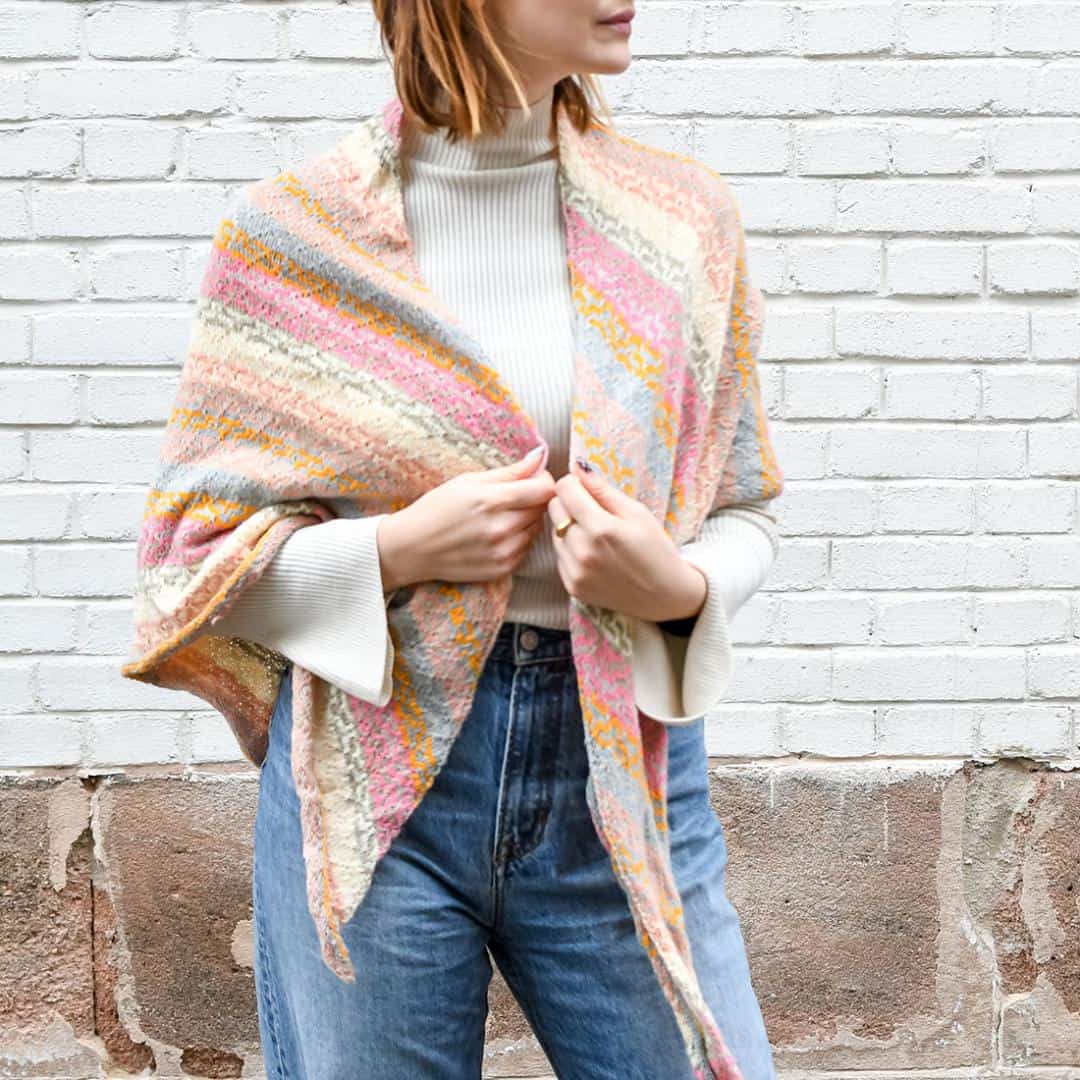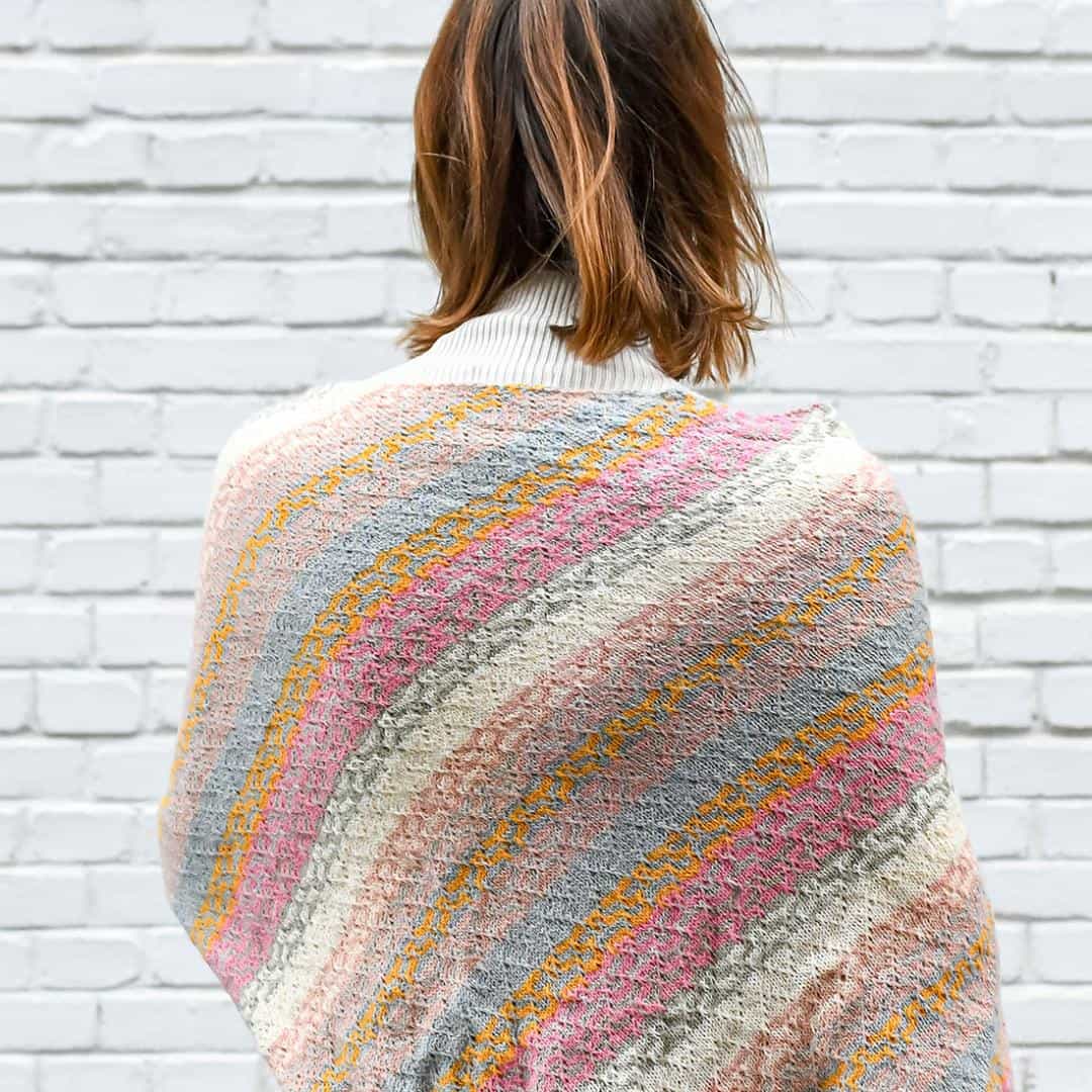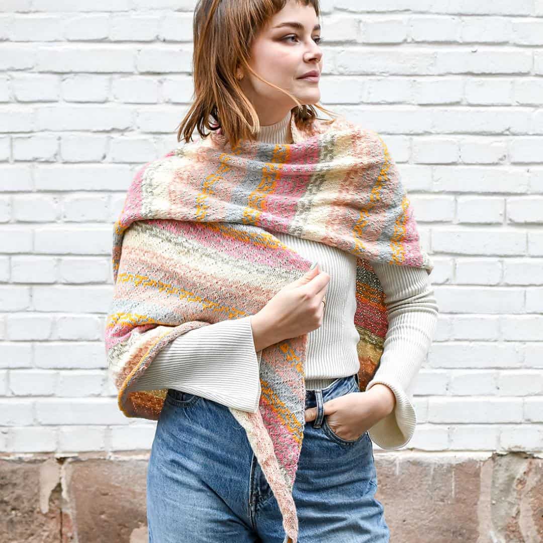 Dieser Schal von Melissa Leapman ist ein gemütlicher Schal, der acht Farben in einem harmonischen und unterhaltsamen Slip-Stitch-Muster kombiniert. Dieses Schmuckstück misst 178 x 127 cm und besteht aus Kremke Soul Wool Edelweiss Alpaka. Für dieses Projekt benötigst du 2 Knäuel in den Farben 15, 01, 08, 51, 17, 12, 30 und 4 Knäuel in der Farbe 53. Die empfohlene Nadelstärke ist 3,25 mm und es wird eine 74 cm Rundstricknadel verwendet, um die große Anzahl an Maschen aufzunehmen. Die Anleitung (nur in englischer Sprache) und die passende Wolle können in unserem Online-Shop bestellt werden.