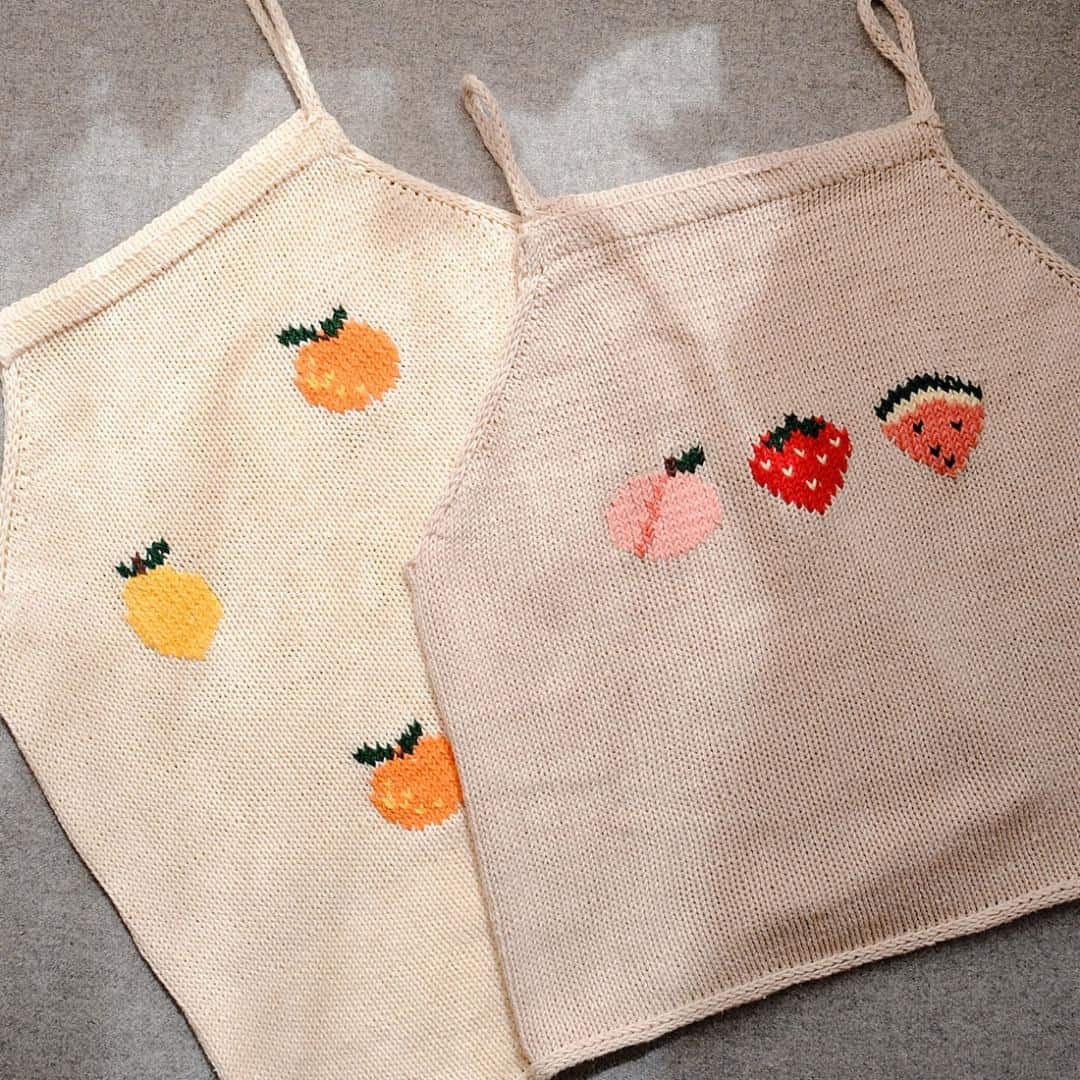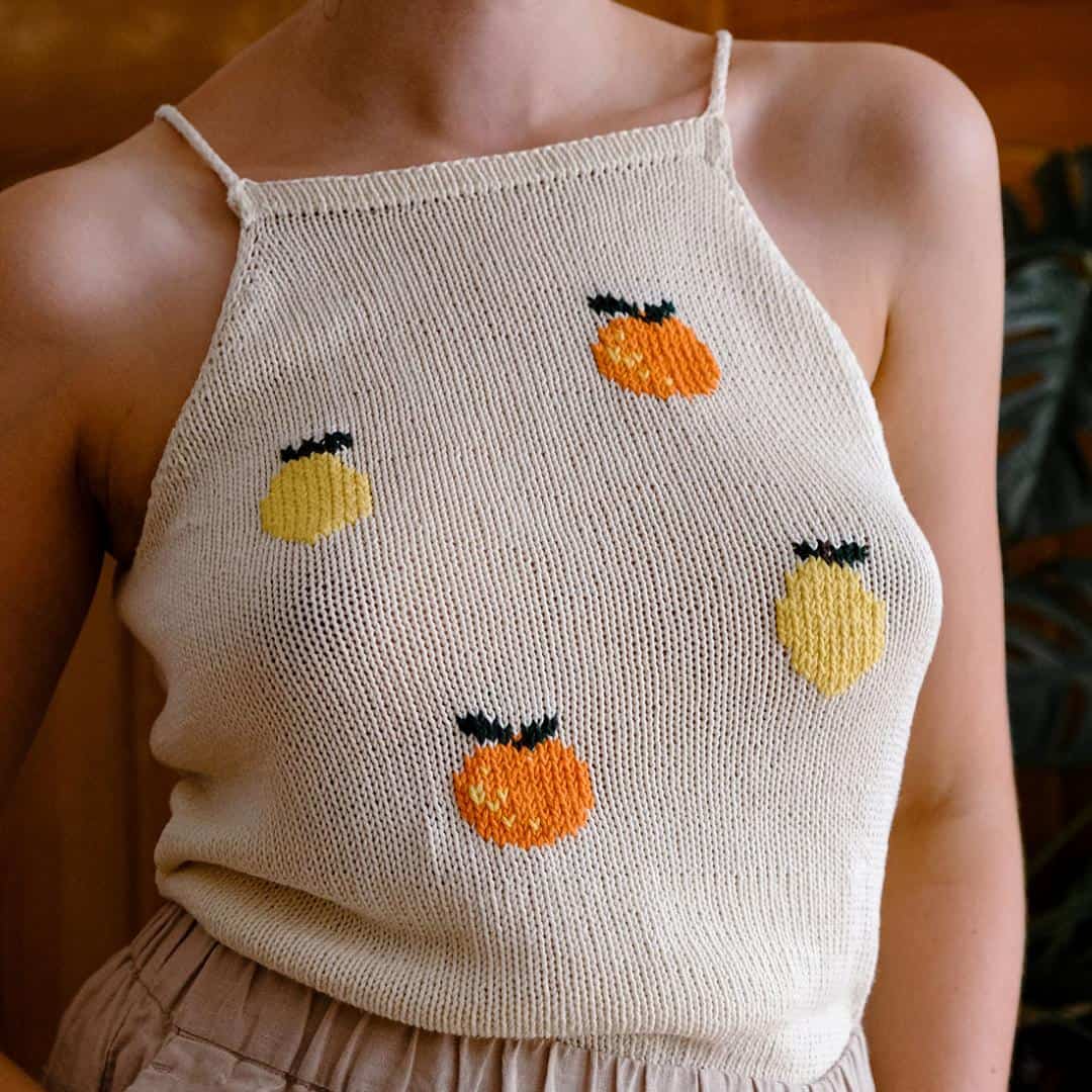 Charmantes Top mit aufgestickten Früchten, von oben nach unten gestrickt und individuell anpassbar, perfekt für einen heißen Sommer.