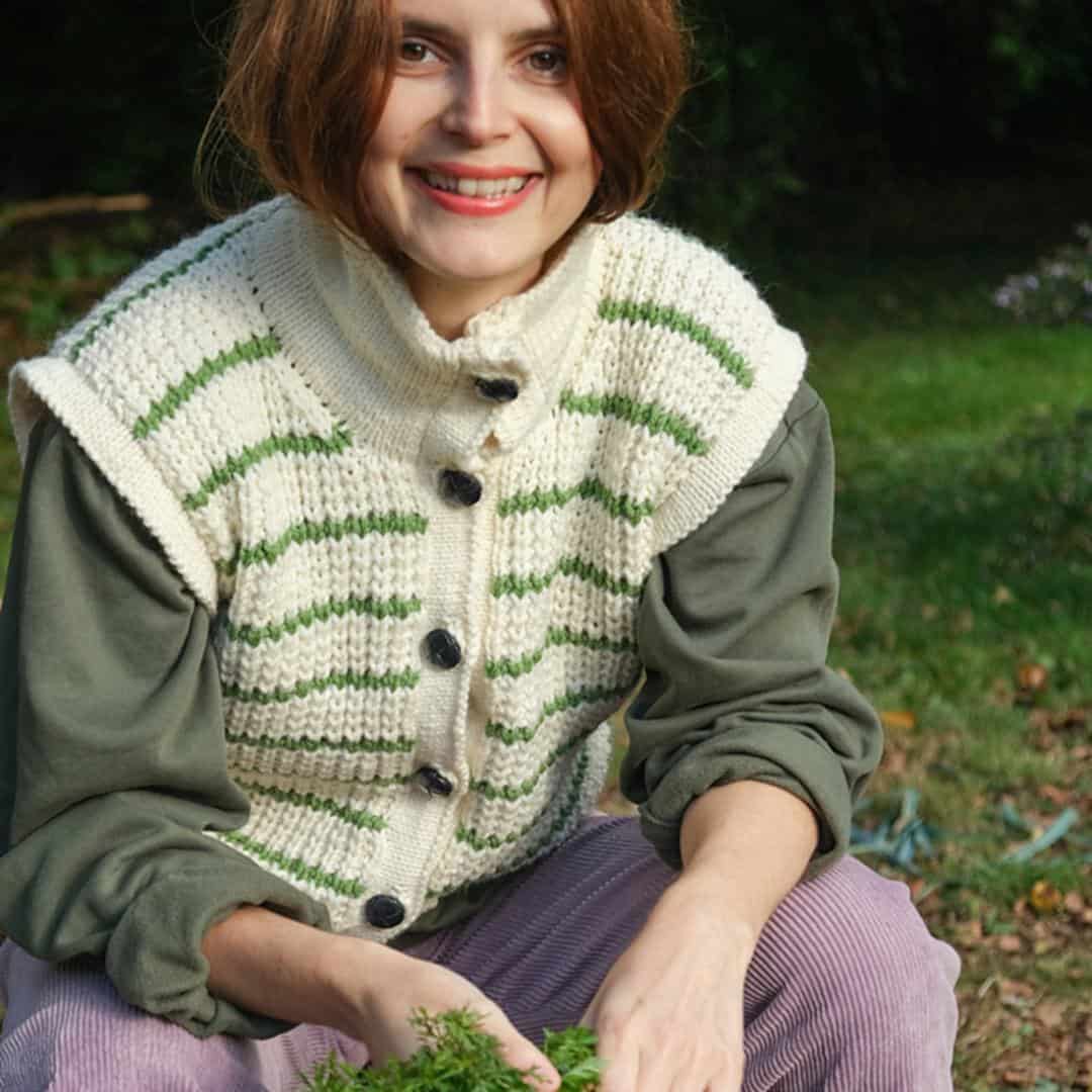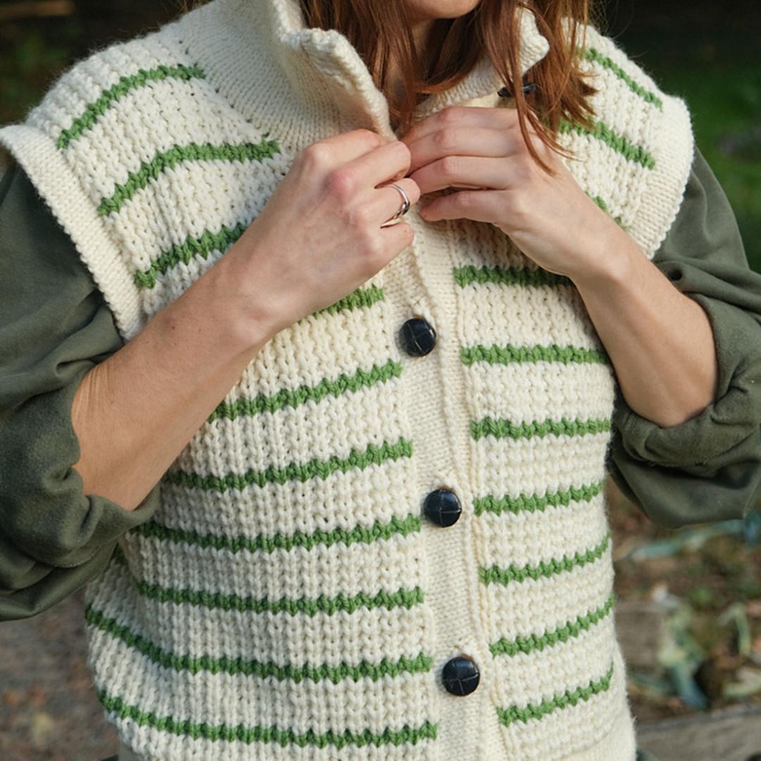 Die Betsey Weste, entworfen von Alice Hammer, ist ein charmantes Strickmuster, das sowohl Anfänger als auch erfahrene Stricker begeistert. Die Weste wird aus 100 % Merry Merino Wolle von Kremke Soul Wool gestrickt und bietet ein weiches, warmes Tragegefühl. Die Anleitung umfasst Größen von S bis 5XL und verwendet zwei Garnfarben: die Hauptfarbe ‚Naturel‘ und die Streifenfarbe ‚Vert prairie‘. Die Weste hat eine Mehrweite von 5 bis 10 cm. Zu den benötigten Utensilien gehören Rundstricknadeln in den Größen US 4 und US 7, eine Häkelnadel für den provisorischen Anschlag, Maschenmarkierer, ein Reihenzähler und sechs 25 mm Knöpfe. Die Maschenprobe beträgt 18 Maschen und 22 Reihen auf 10 cm mit US 7 Nadeln im gebrochenen Rippenmuster. Die Wolle und die passende Anleitung sind in unserem Shop Wollke erhältlich.