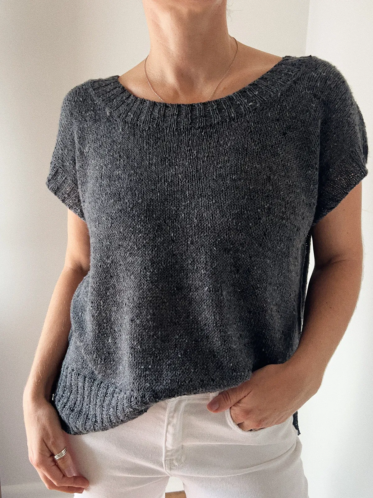 Das Shirt wird nahtlos von oben nach unten gearbeitet und hat seitliche Schlitze sowie klassische 2×2-Rippenbündchen an Saum, Ärmeln und Kragen. Die Anleitung bietet zwei Varianten: eine Standardlänge und eine leicht kurzgeschnittene Version.