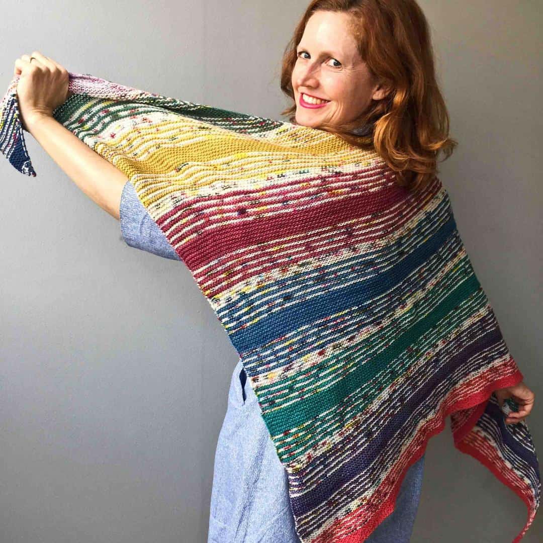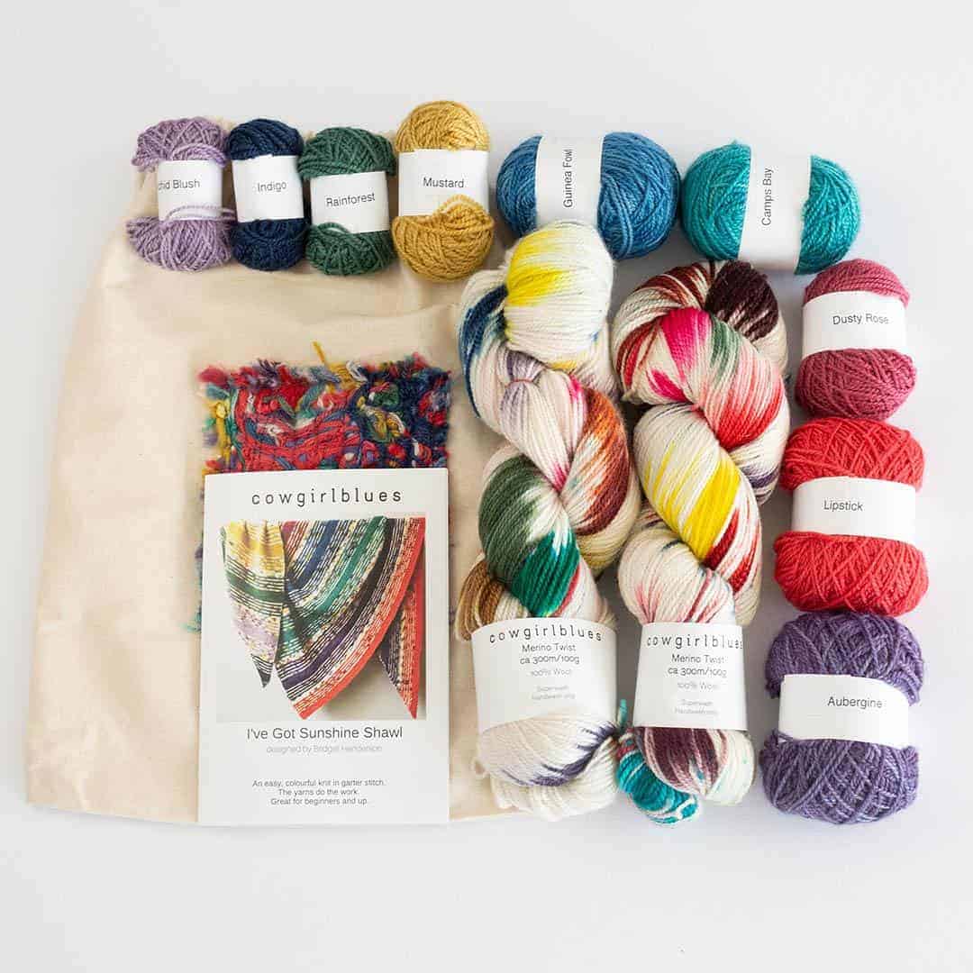 Wunderschönes Stickset aus handgefärbter Merinowolle für ein wärmendes, fröhliches Schultertuch, inklusive Anleitung.